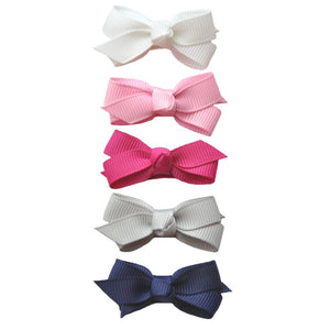 High quality grosgrain bow tied into our 'boutique style' bow. Boutique hair bows are gorgeous and have a little knot in the centre with loops on the sides. The bow is about 42 mm in total length and at its widest is about 23 mm wide loops. The ribbon used is 3/8 inch wide ribbon (9 mm)and tied at the center with 1/4 inch (6 mm) ribbon. Bow is attached to our 30 mm stainless steel ribbon wrapped snap clip. Snap clips slide in and "snap" shut like a barrette style. Do not use in damp hair. Never leave a child unattended with Hair Clips as CAUTION: SMALL PARTS - CHOKING HAZARD IF PUT IN MOUTH.