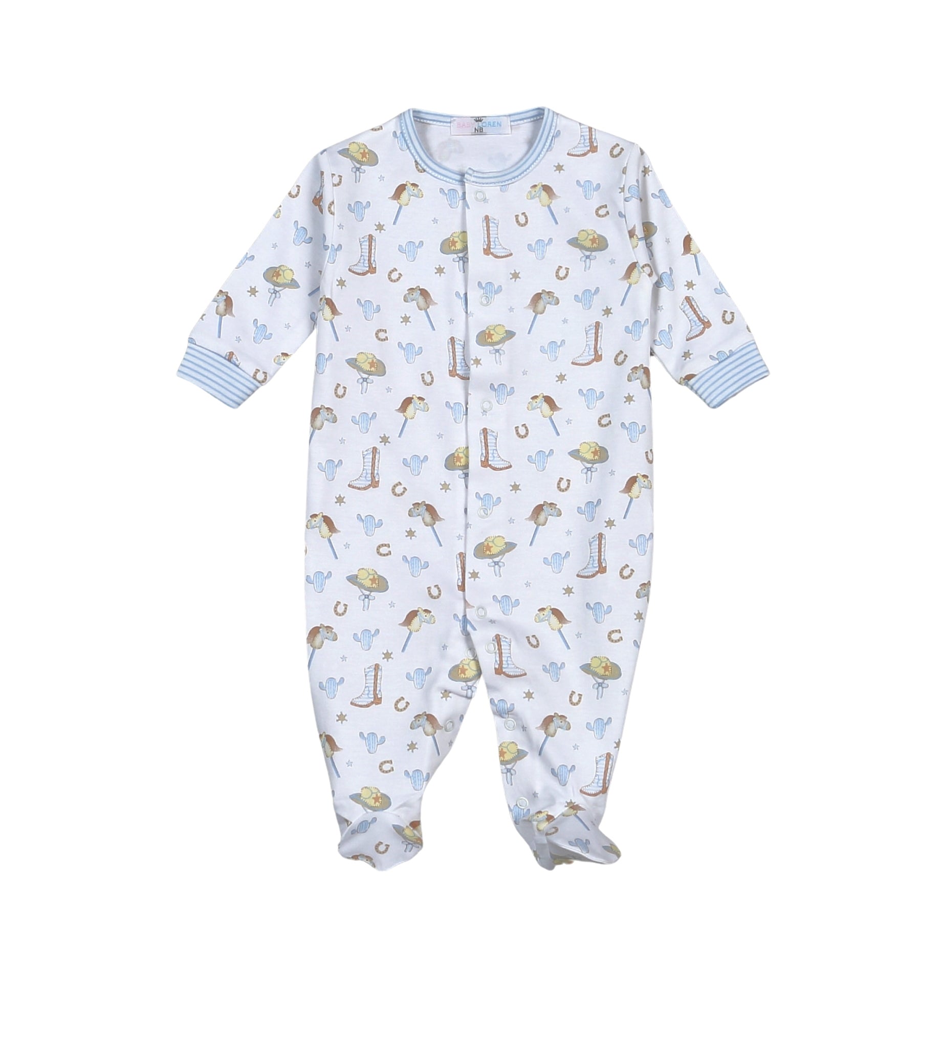 Made from 100% Peruvian Pima cotton, the Howdy Baby Blue Pima Zipper Footie offers exceptional softness and breathability ideal for delicate baby skin. Its long sleeves and full-length zipper provide easy dressing and secure warmth, while the charming western-themed print adds a playful, stylish touch. Perfect for everyday comfort and gentle enough for sensitive skin, this footie combines quality craftsmanship with practical design.