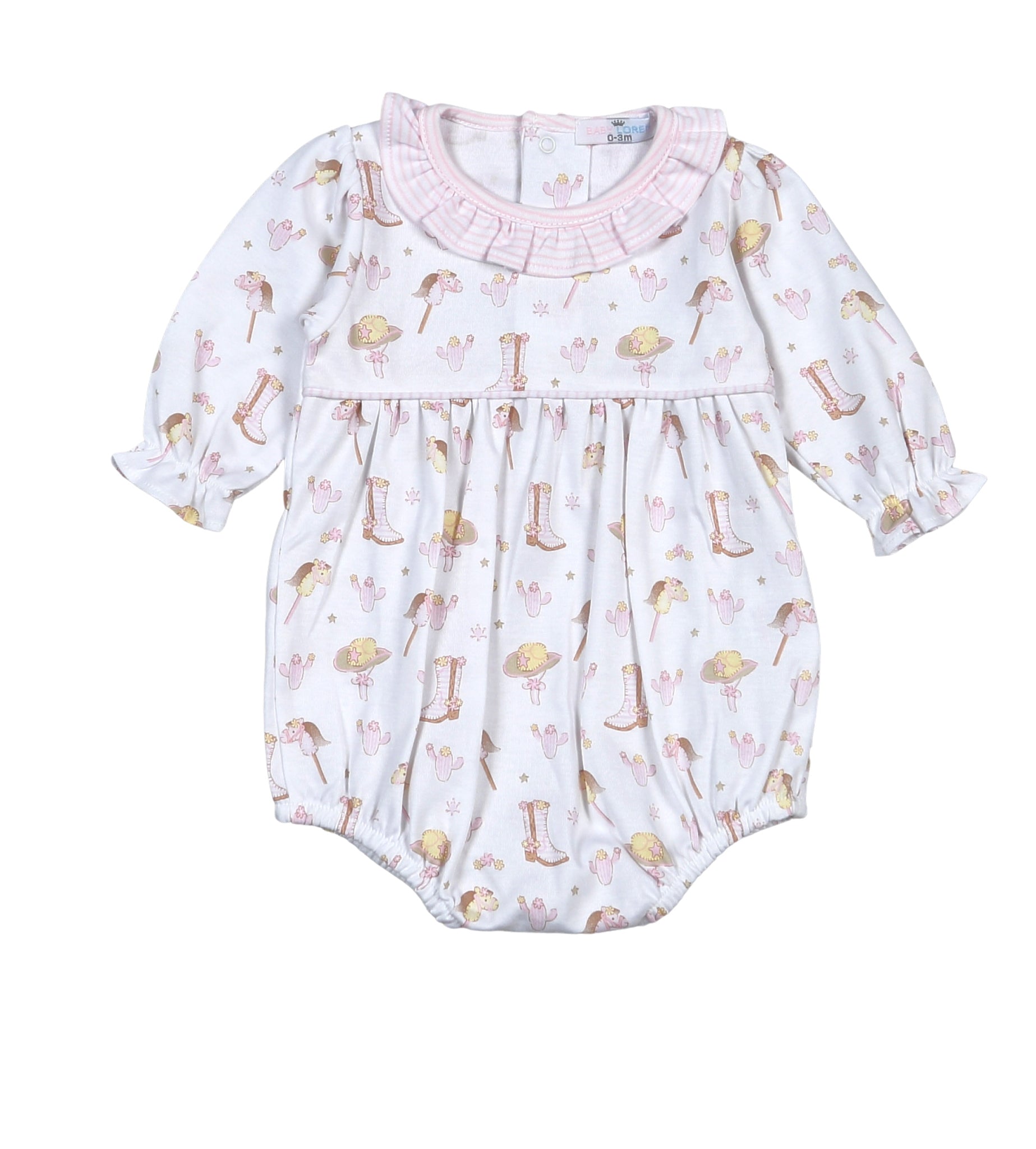 Crafted from 100% premium pima cotton, this western-inspired baby girl bubble features delicate ruffles along the neckline and sleeves. Its soft, breathable fabric ensures gentle comfort, while the charming design adds a touch of classic western style, perfect for your little one’s everyday adventures.