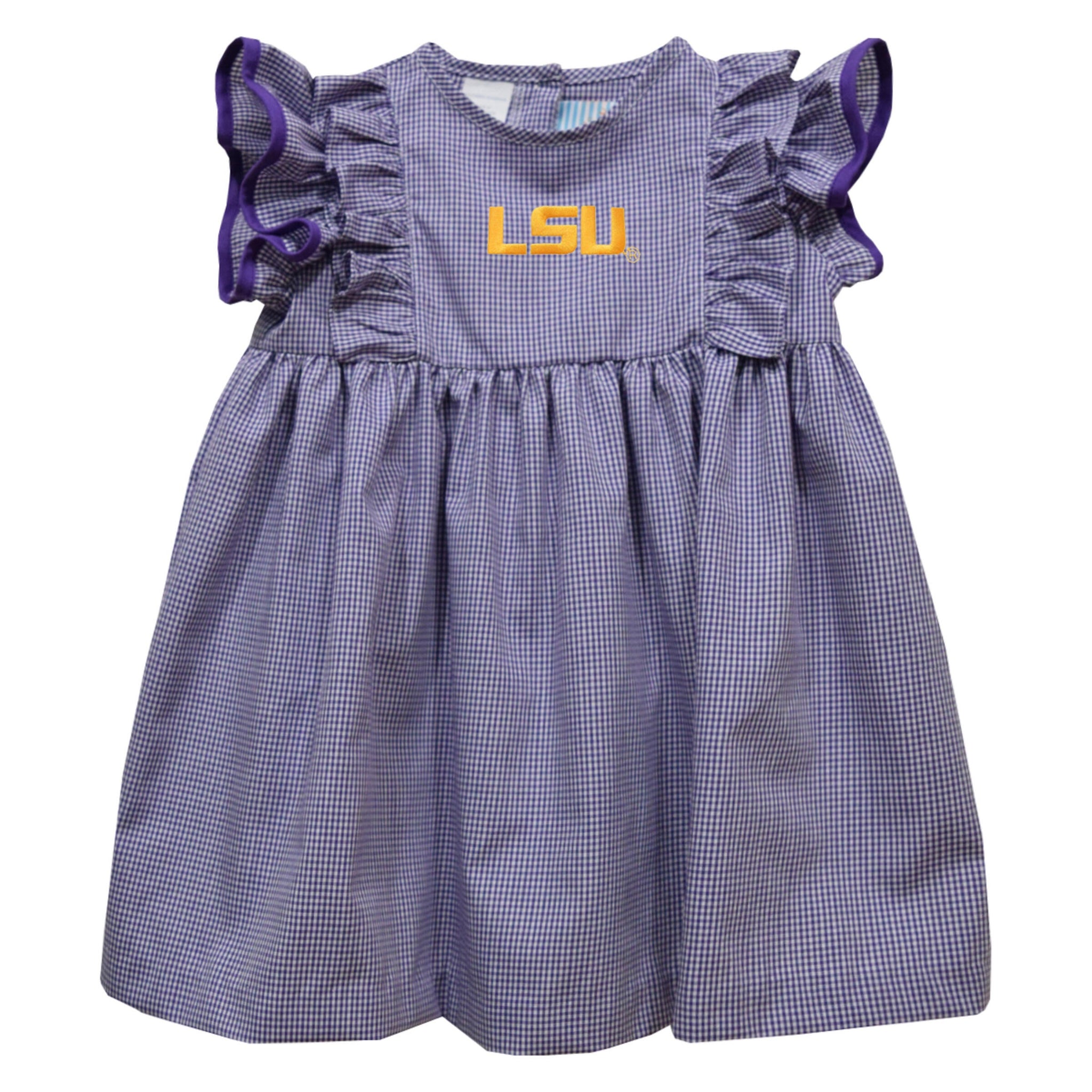 This LSU Tigers dress features a charming purple and white gingham fabric with elegant double ruffle sleeves accented by purple trim. The front proudly displays a finely embroidered gold LSU logo, making it an ideal choice for young fans to showcase team spirit on game days. Designed for both comfort and style, it’s perfect for spirited occasions.