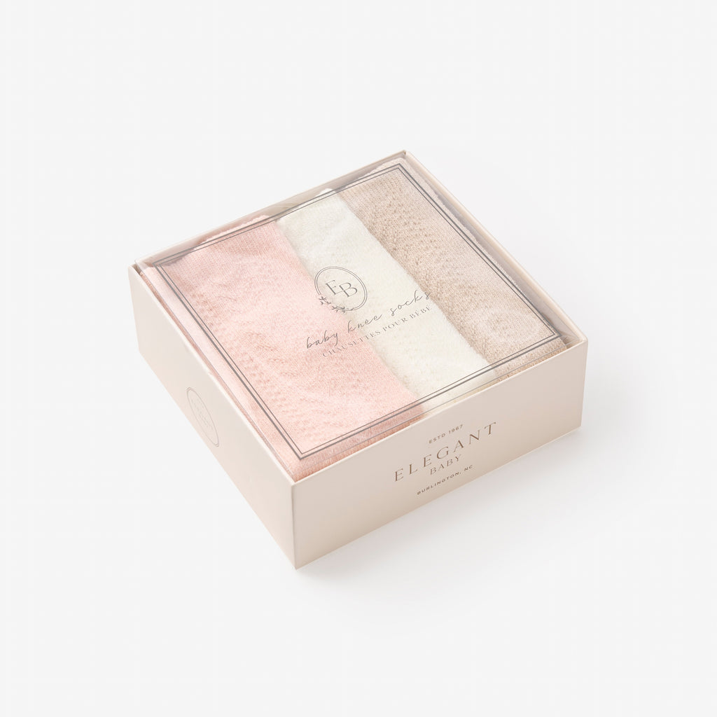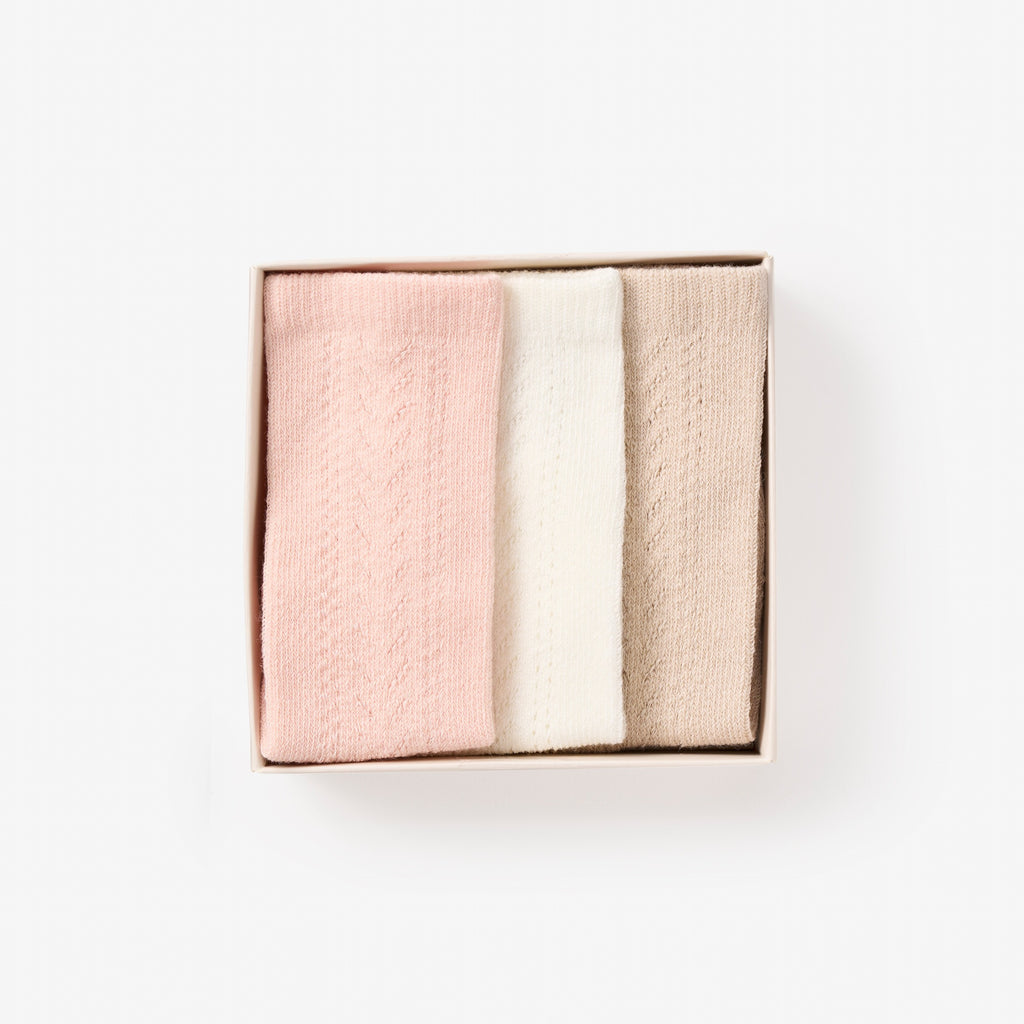 A charming trio of pointelle knee socks in soft pink, crisp white, and warm taupe. Designed with delicate openwork detailing and a gentle fit, these timeless essentials add a touch of sweetness and comfort to baby's everyday looks.