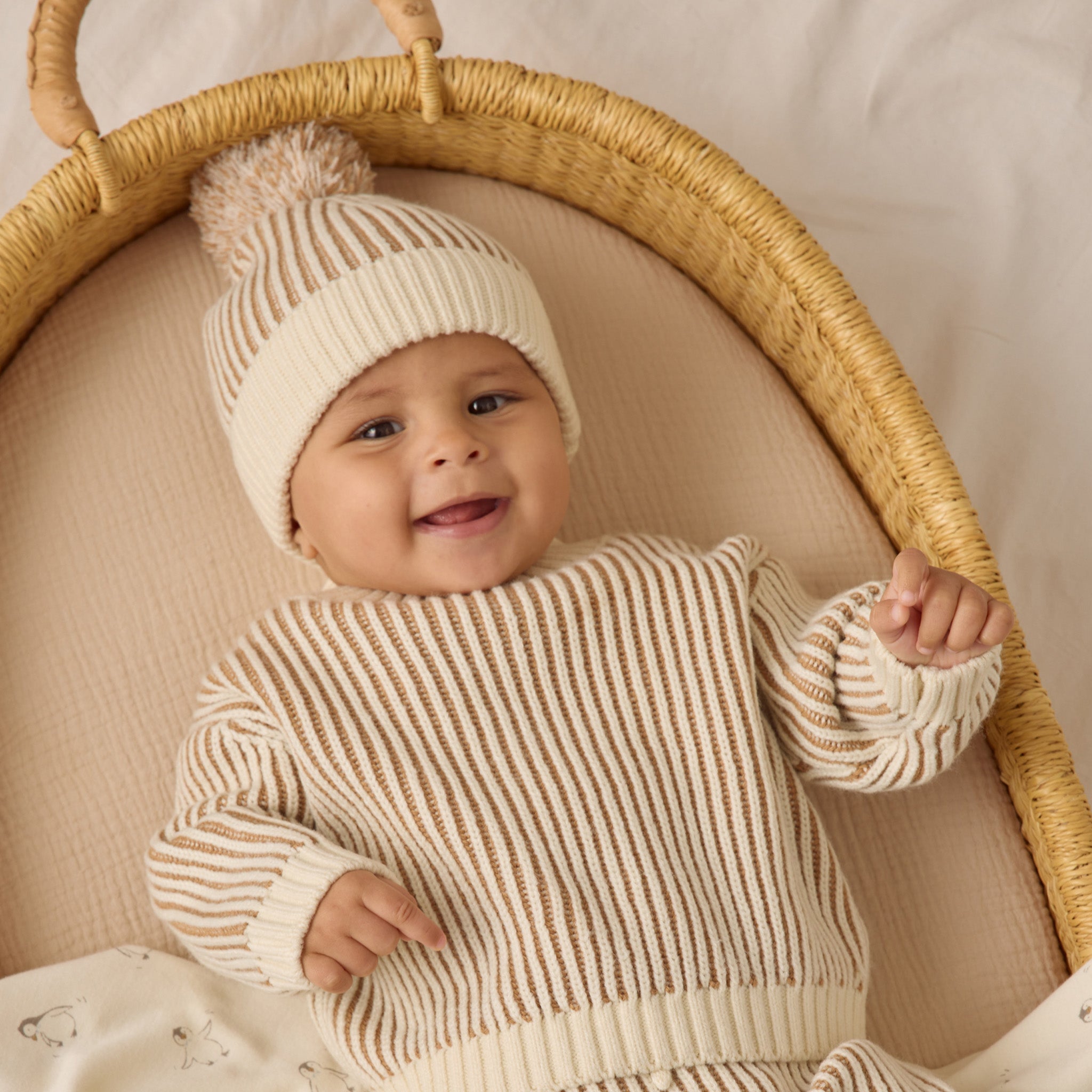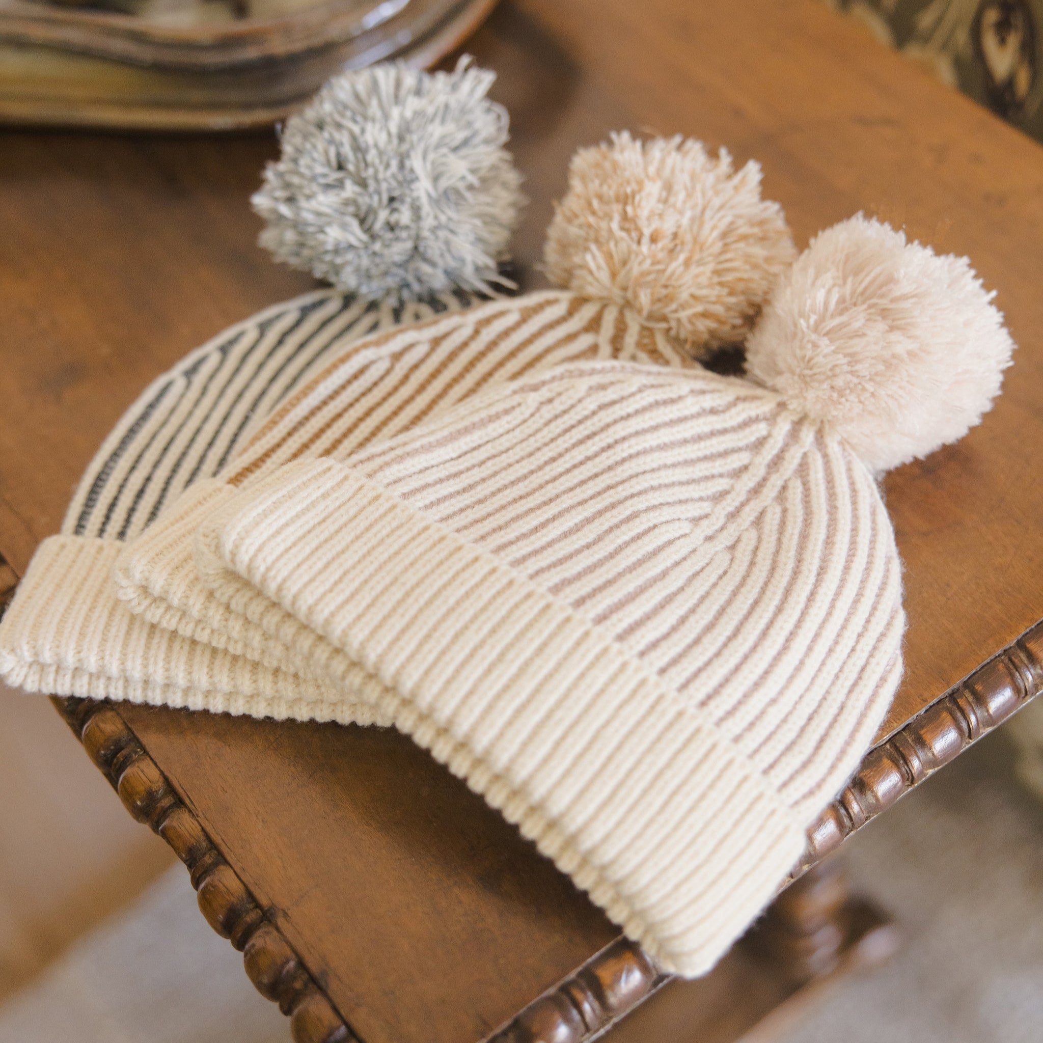 This cozy knit beanie features contrast ribbing and a playful pom pom, making it the perfect finishing touch for little ones’ cold-weather outfits.