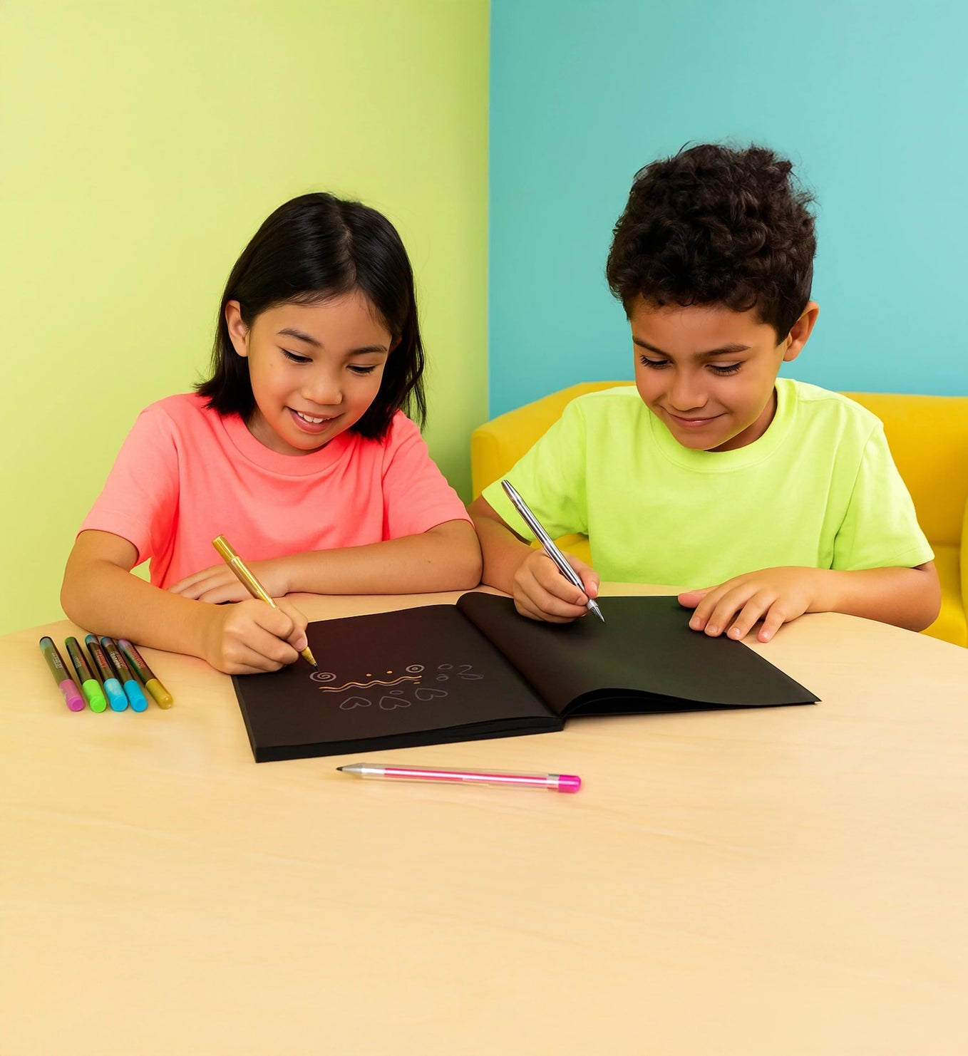 Turn ideas into artwork with this DIY sketchbook, designed for artists who love to make their mark inside and out! Featuring a customizable cover, this drawing kit lets you create a one-of-a-kind sketchbook that reflects your personal style. Whether using metallic gel pens, metallic markers, or other creative tools, you can decorate the cover with unique designs, lettering, or patterns.Inside, you'll find both black and white paper pages, perfect for sketching, doodling, hand lettering, and mixed media projects. -Includes 40 Page Sketchbook (9” X 7") of 20 Black Paper Pages & 20 White Paper, 6 Metallic Ink Markers, 6 Metallic Ink Gel Pens -Great for use with metallic gel pens, metallic markers, and mixed media -Suitable for ages 8+