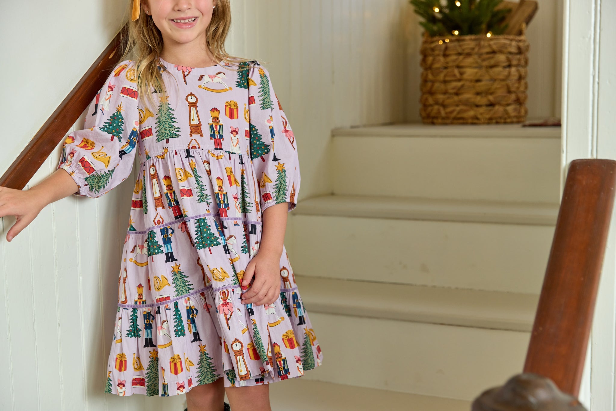 Sugarplum Dreams! Your little ballet lover will be ready to pirouette, leap and take a bow alongside everything she loves about the Nutcracker in our Girls Peachy Dress in Lavender Nutcracker. This swingy triple tiered silhouette features lavender velvet taping at the tiers a 3/4 puff sleeve sleeve and an invisible zipper at the back.