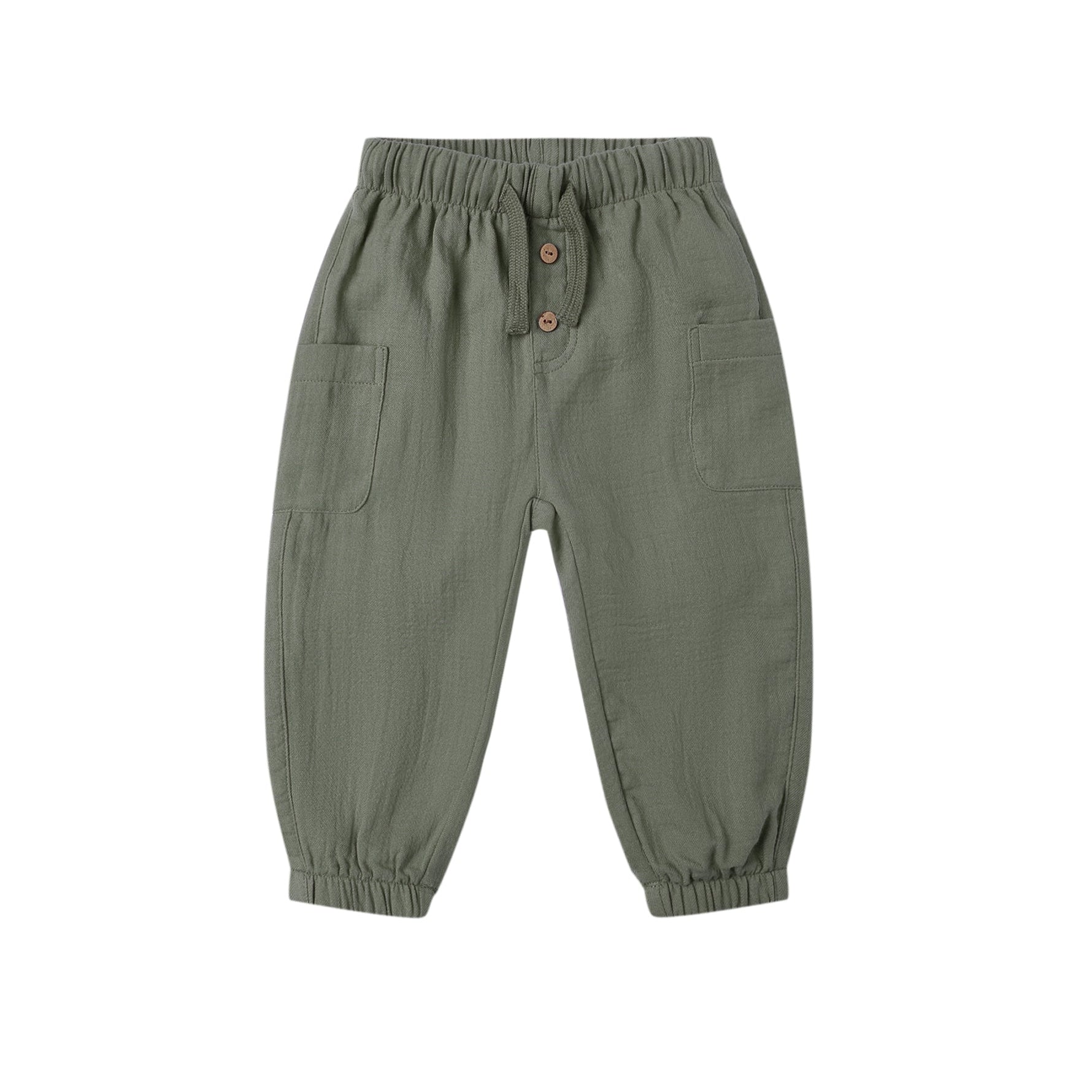 Comfortable corduroy pants with an elastic waistband and leg openings, adjustable drawstring, and side patch pockets.