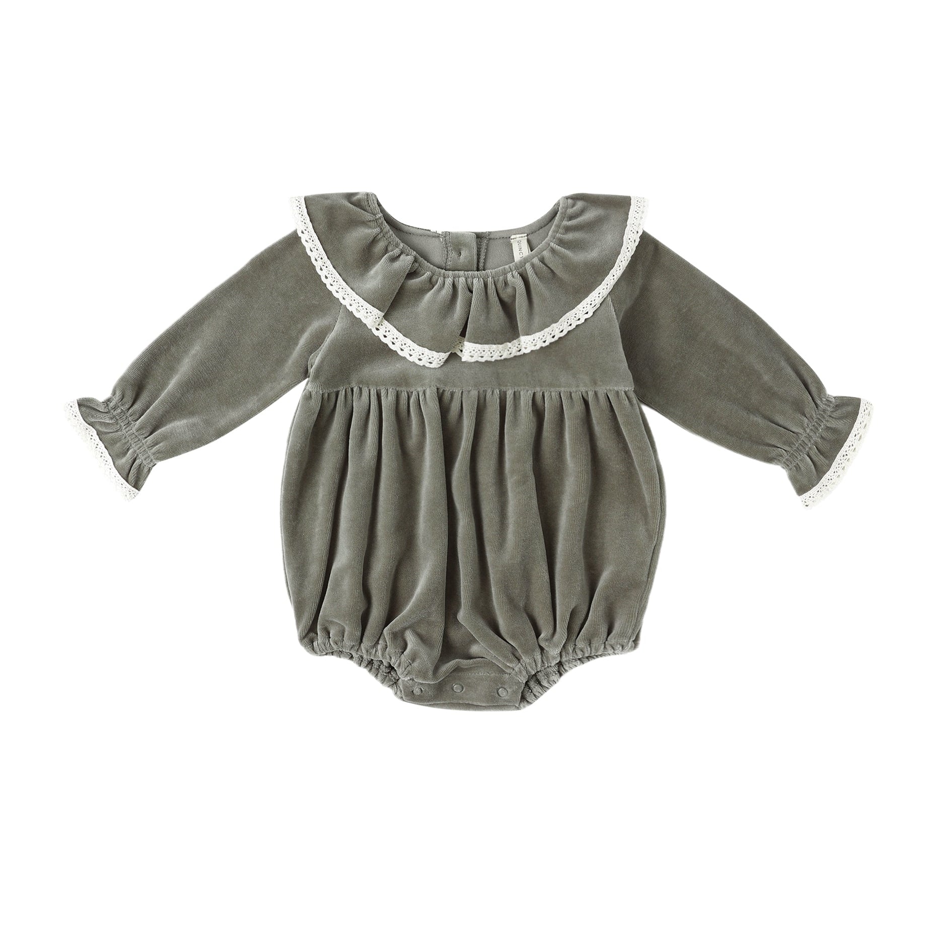 Longsleeve velour romper with gathered waist, ruffle collar, and lace trim details at neckline and cuffs. Snap closures along the inseam for easy changing.