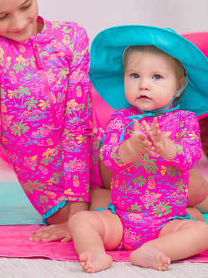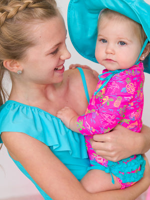 A wonderful addition to your baby girl's swimwear, this One Piece Rash Guard is comfort and style rolled into one. Snaps at inseam for easy diaper changes. Precious ruffles on the bum. Made with sun protected fabric for all day protection and comfort.