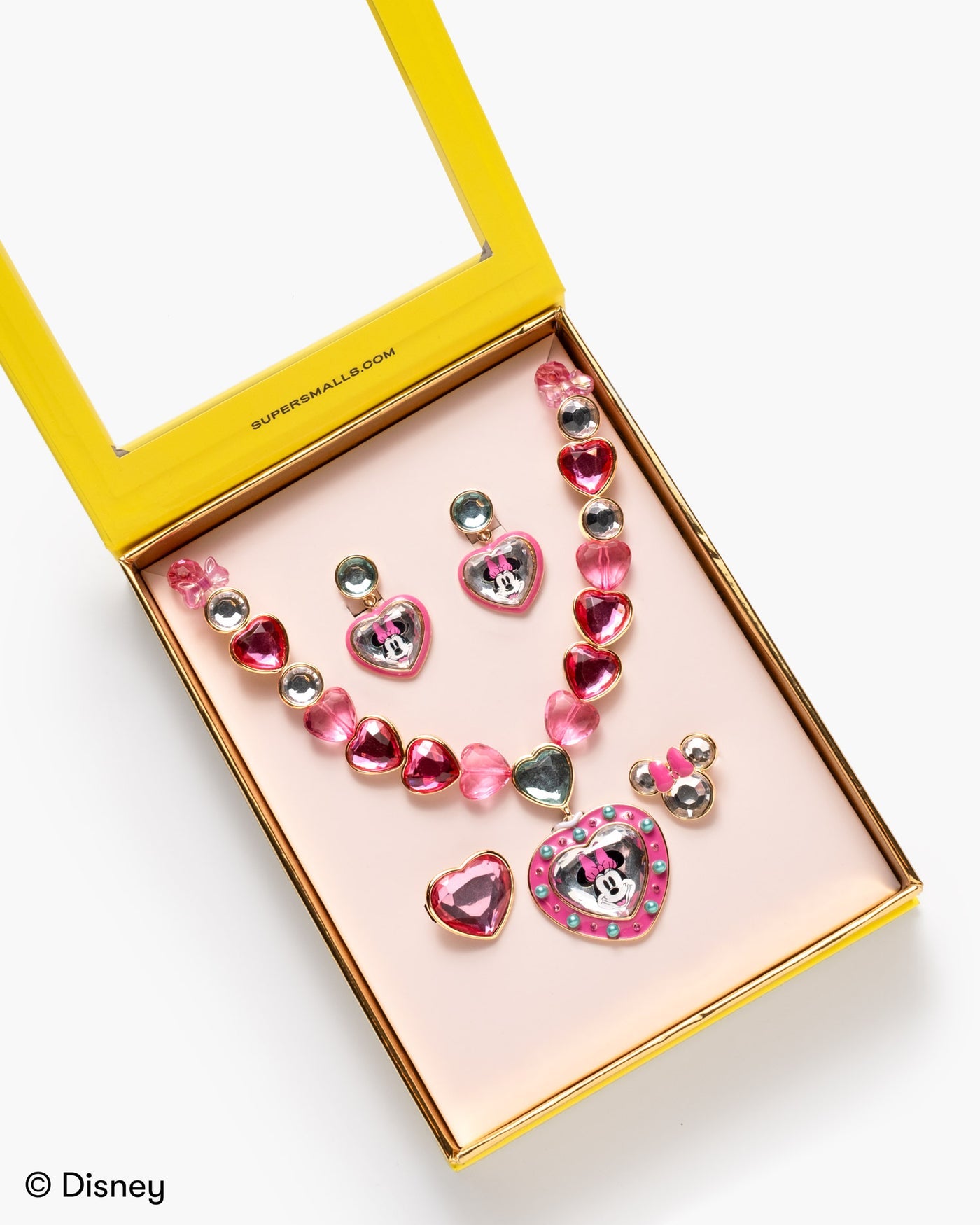 Get ready to shine with our Disney Minnie Mouse Mega Set! This set features a stretchy Minnie Necklace with a pink heart-framed Minnie Mouse pendant, clip-on earrings with sparkling gems and heart-shaped Minnie Mouse pendants, and two pairs of adjustable rings. Designed for kids to play with, it's super easy for little ones to take on and off themselves. Perfect for adding a touch of Minnie Mouse charm to any outfit and making every day a little more fabulous!