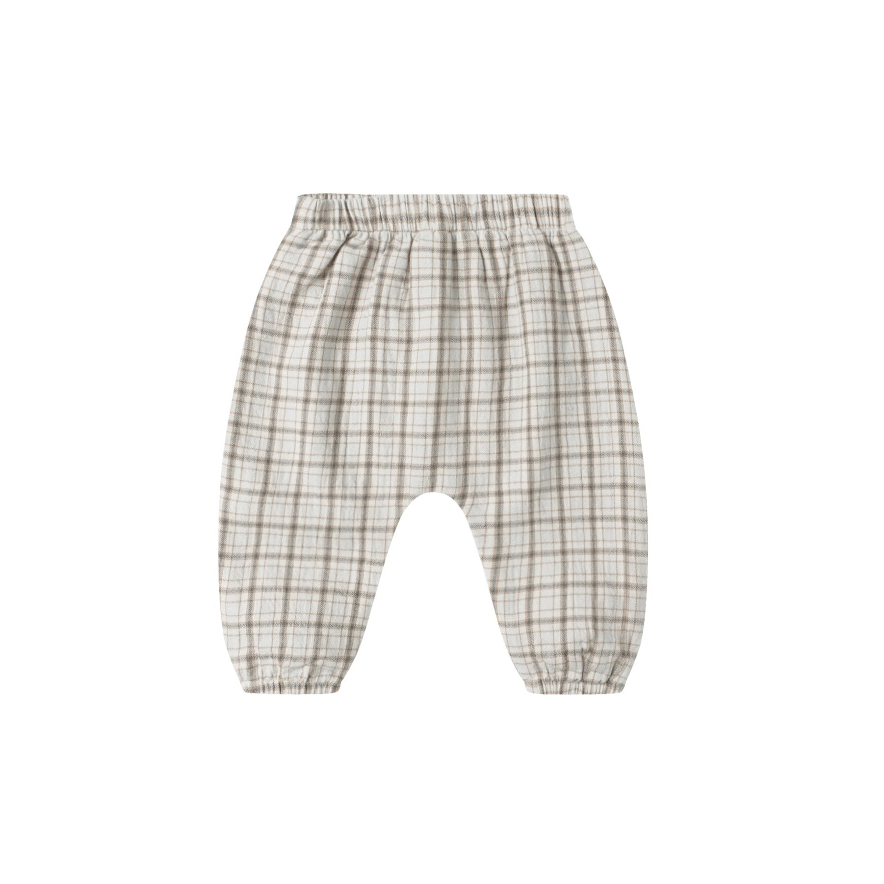 Woven pants with an elastic waistband and leg openings, designed with a dropped crotch for a relaxed, easy fit.