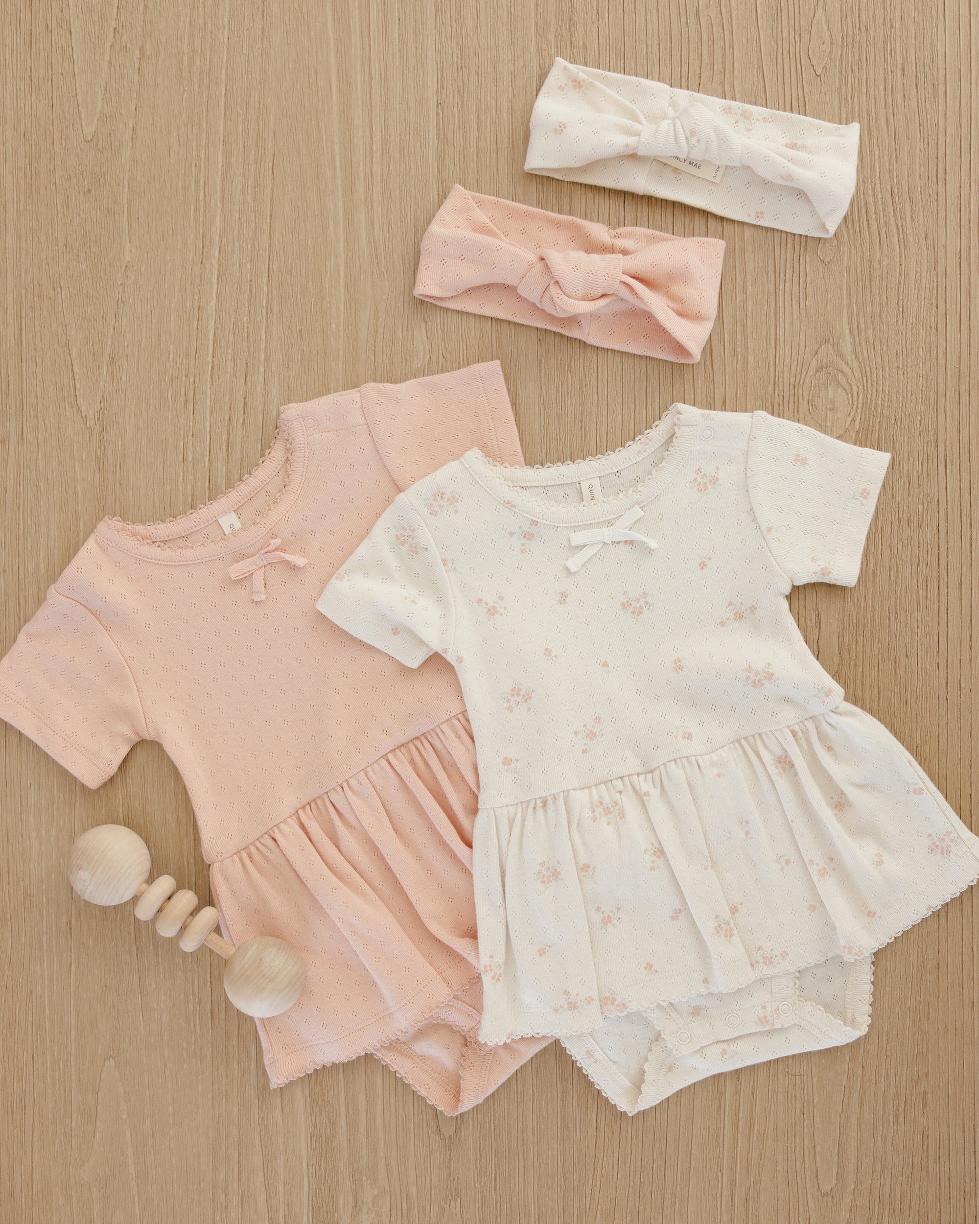 From your friends at Rylee + Cru comes Quincy Mae, a line of baby clothing basics for newborn babies thru 2-3y toddler sizes, inspired by the designers third child, Quincy Mae. Uber soft organic cotton fabrics in brushed jersey, ribbed knit, pointelle and fleece guarantee that the clothing going on your baby boys and baby girls will be soft as their baby skin. In muted shades, these baby basics are perfect for throw on and go, to everyday play and sleepwear for your little babes. Find organic cotton baby tees, pants, footies, jumpsuits, sets, dresses, bloomers, baby booties, socks, swaddles, blankets, baby bonnets, pixie hats and baby turban headbands throughout the full collection of Quincy Mae available at Threadfare Children's Boutique online and in-store in Houston, Texas.