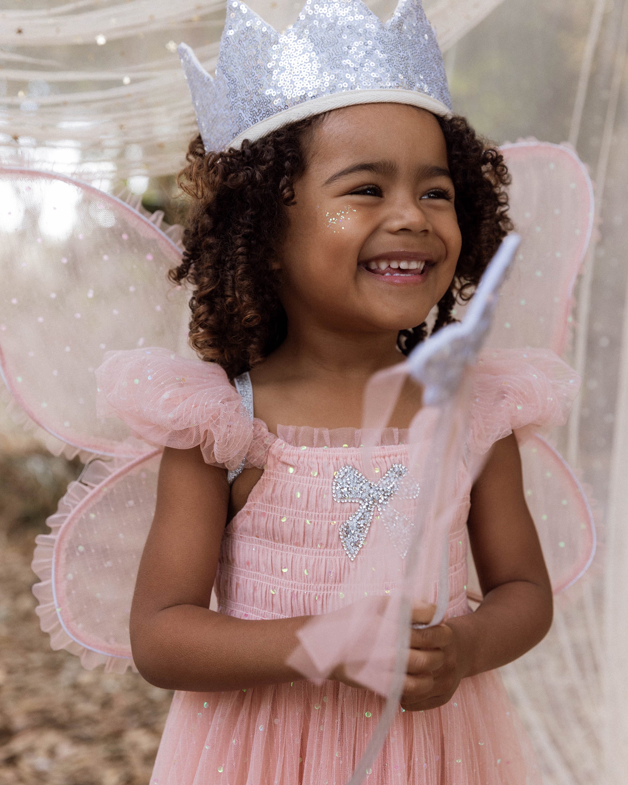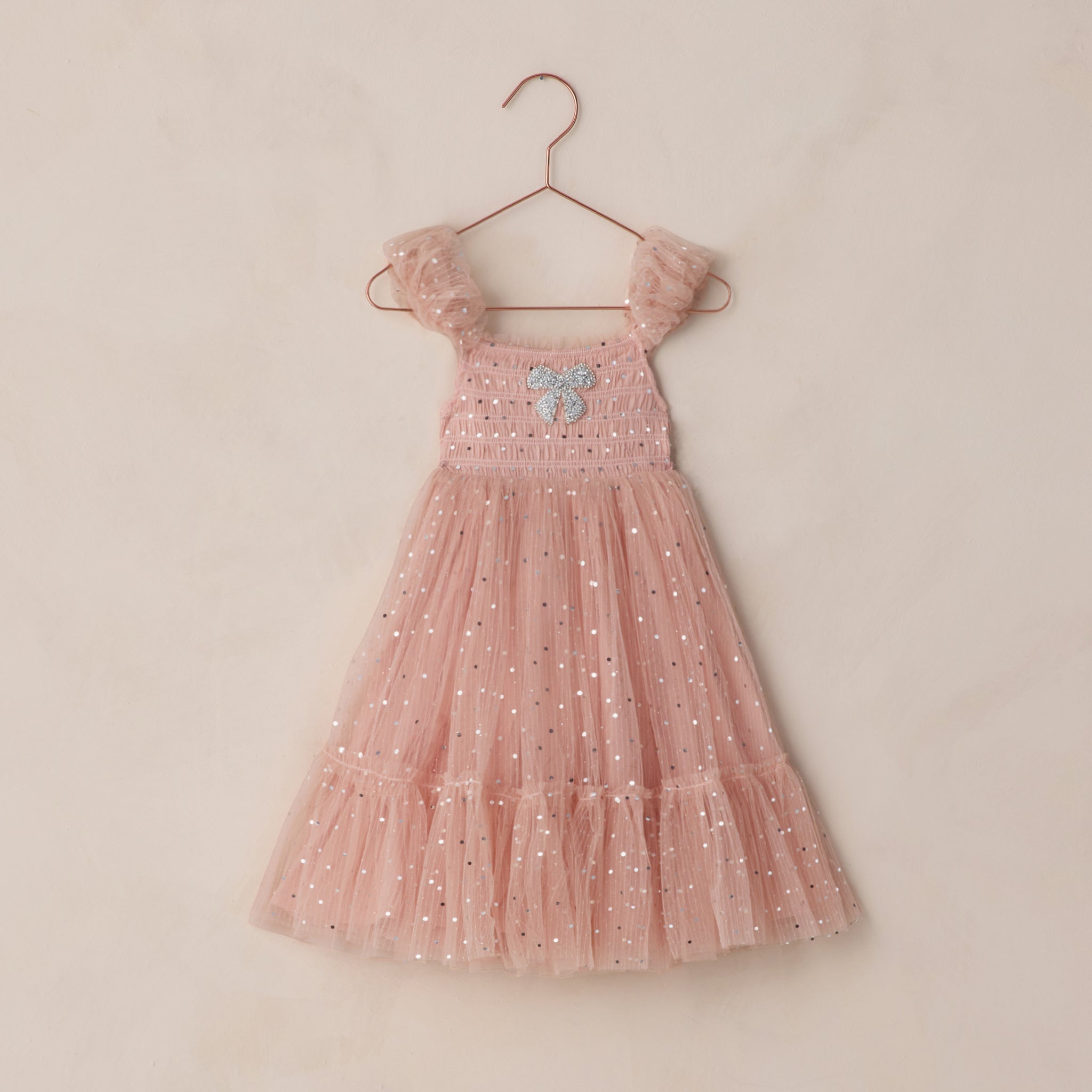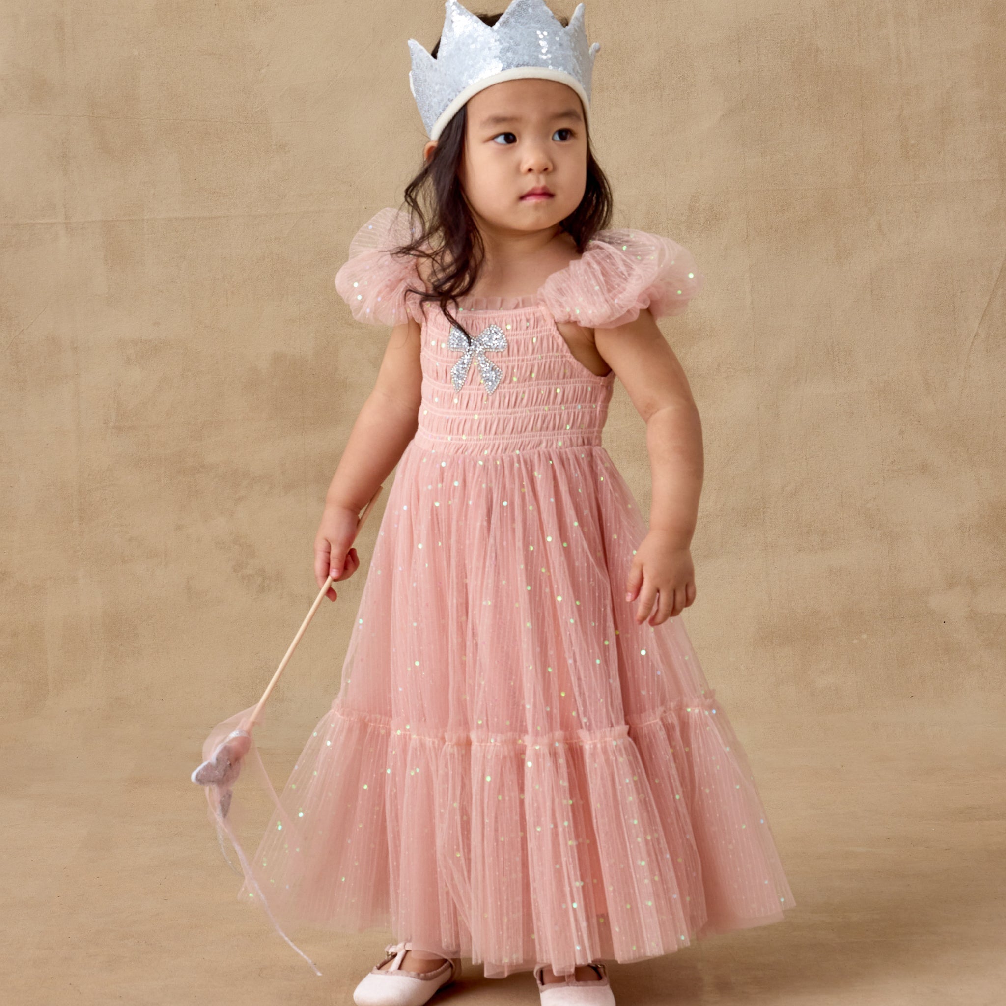 Our Clara Dress, crafted from shimmering tulle, features a smocked bodice adorned with a bow appliqué, gathered bubble cap sleeves, and a full, tiered skirt.