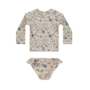 This two-piece swim set features a cute cropped rash guard with coordinating bottoms with ruffle detail.