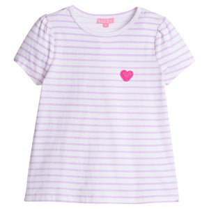 Our Essential Tee will be your go-to piece for Spring. Its lilac stripes with the embroidered heart detail pair perfectly with our Tiered Skort.
