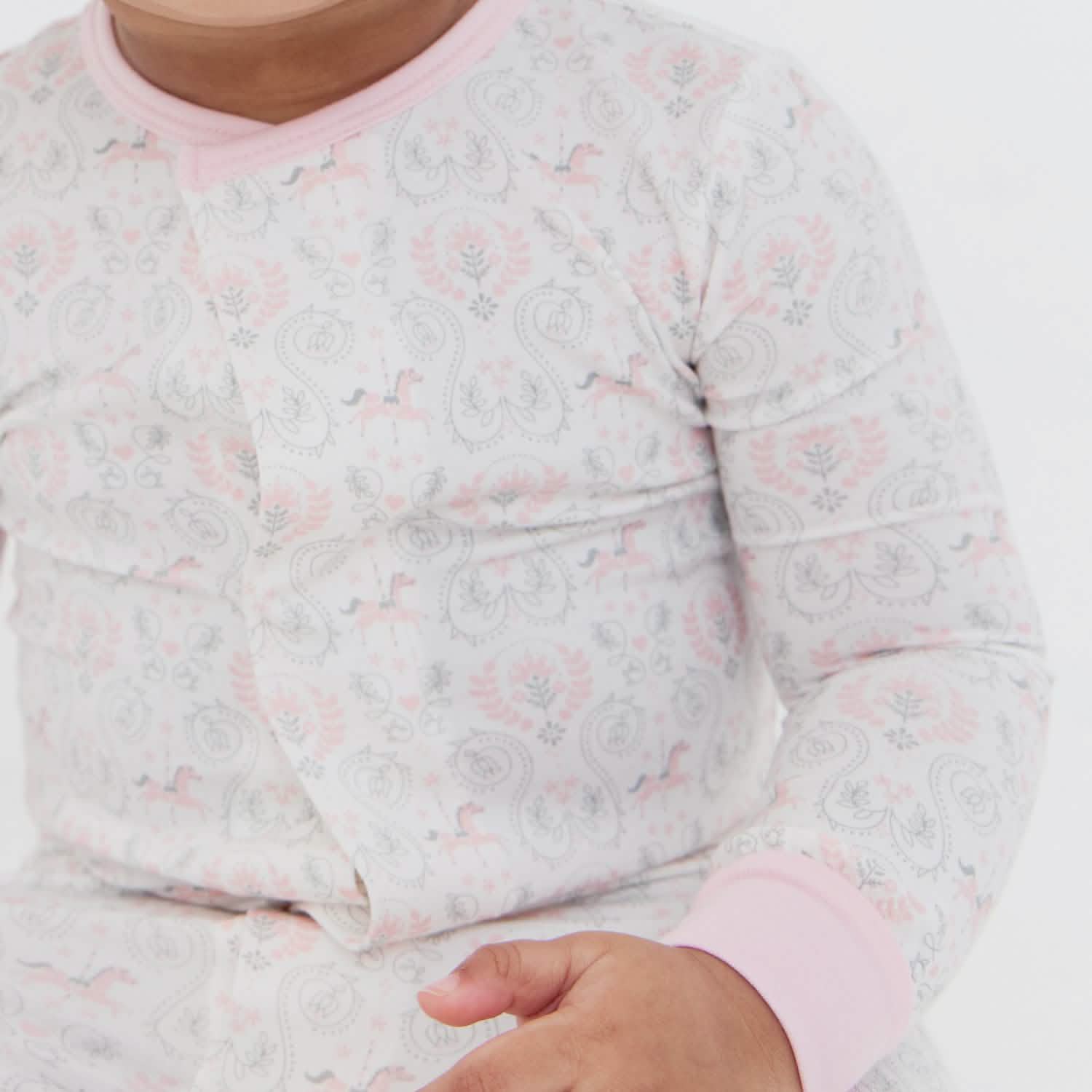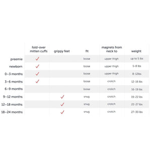• magnetic closures: magnets line the seam from the neck to upper thigh for sizes up to 0-3m & from neck to crotch for sizes 3-6m and up.