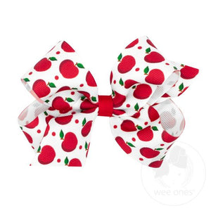Get in the harvest spirit with this playful king hair bow featuring a festive red apple print. Perfect for adding a whimsical touch to any little girl's outfit. Colorful and fun, this bow will make fall even more festive. (Gobble this up now!) This bow is sure to stay in her hair all day with our patented WeeStay™ no-slip hair clip.
