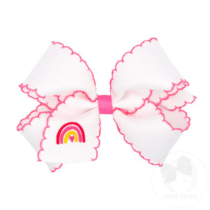 This Wee Ones classic white grosgrain bow features a pretty hot pink moonstitch edge and sweet rainbow and heart embroidered on the tail. This bow is sure to stay in her hair all day with our patented WeeStay™ no-slip hair clip.