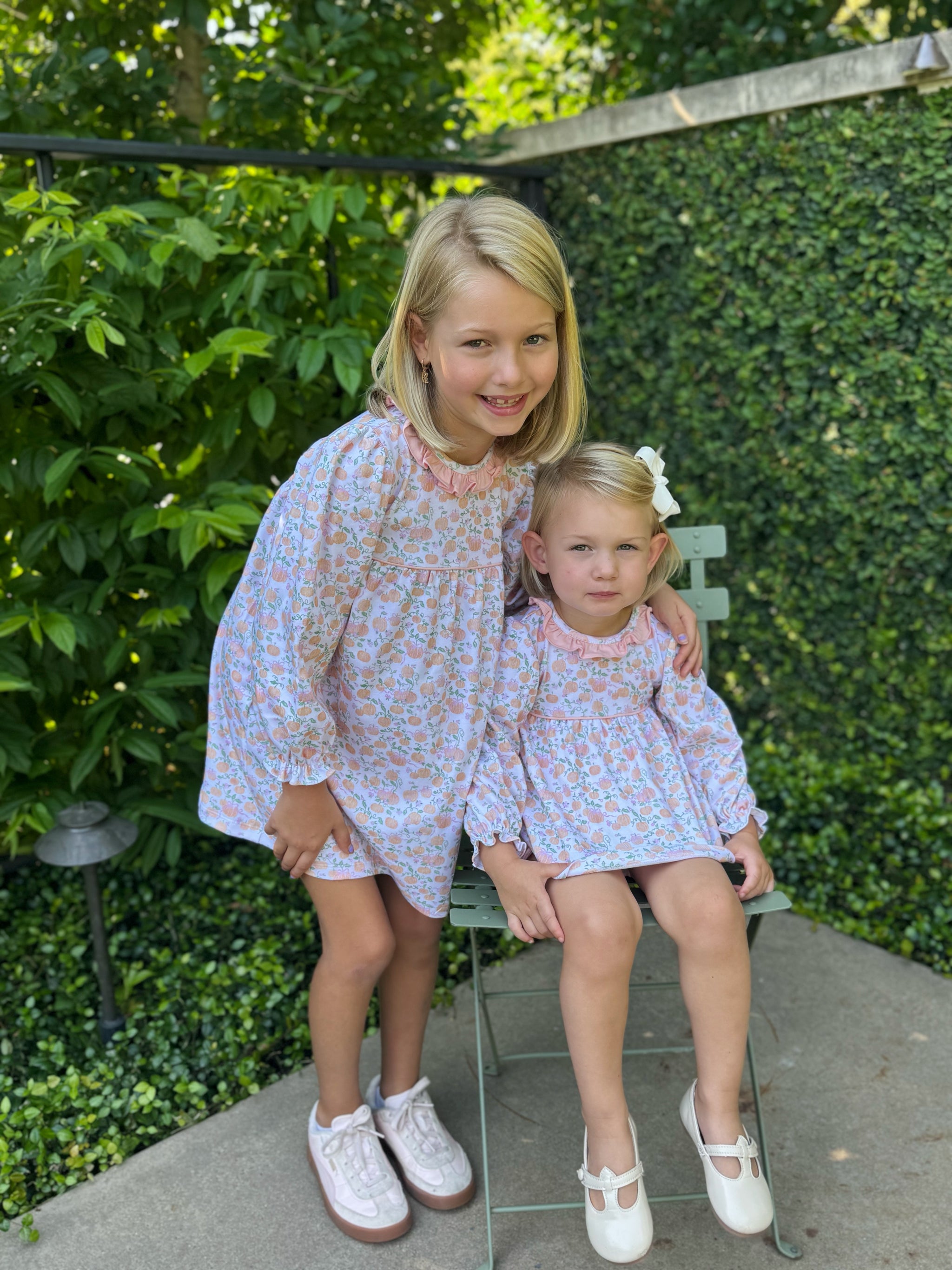 Crafted from super soft knit fabric, this girls' long sleeve dress combines comfort with festive charm. Featuring a darling pink bow and a pastel orange pumpkin print, it captures the essence of pumpkin patch picture perfection. The delicate pink ruffle neckline adds a touch of whimsy, making it ideal for autumn outings and special occasions.