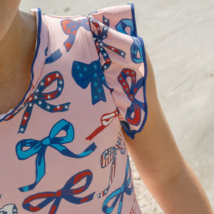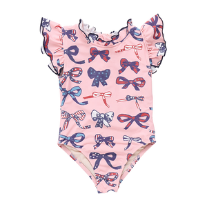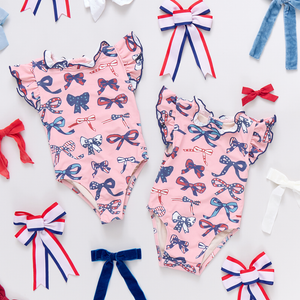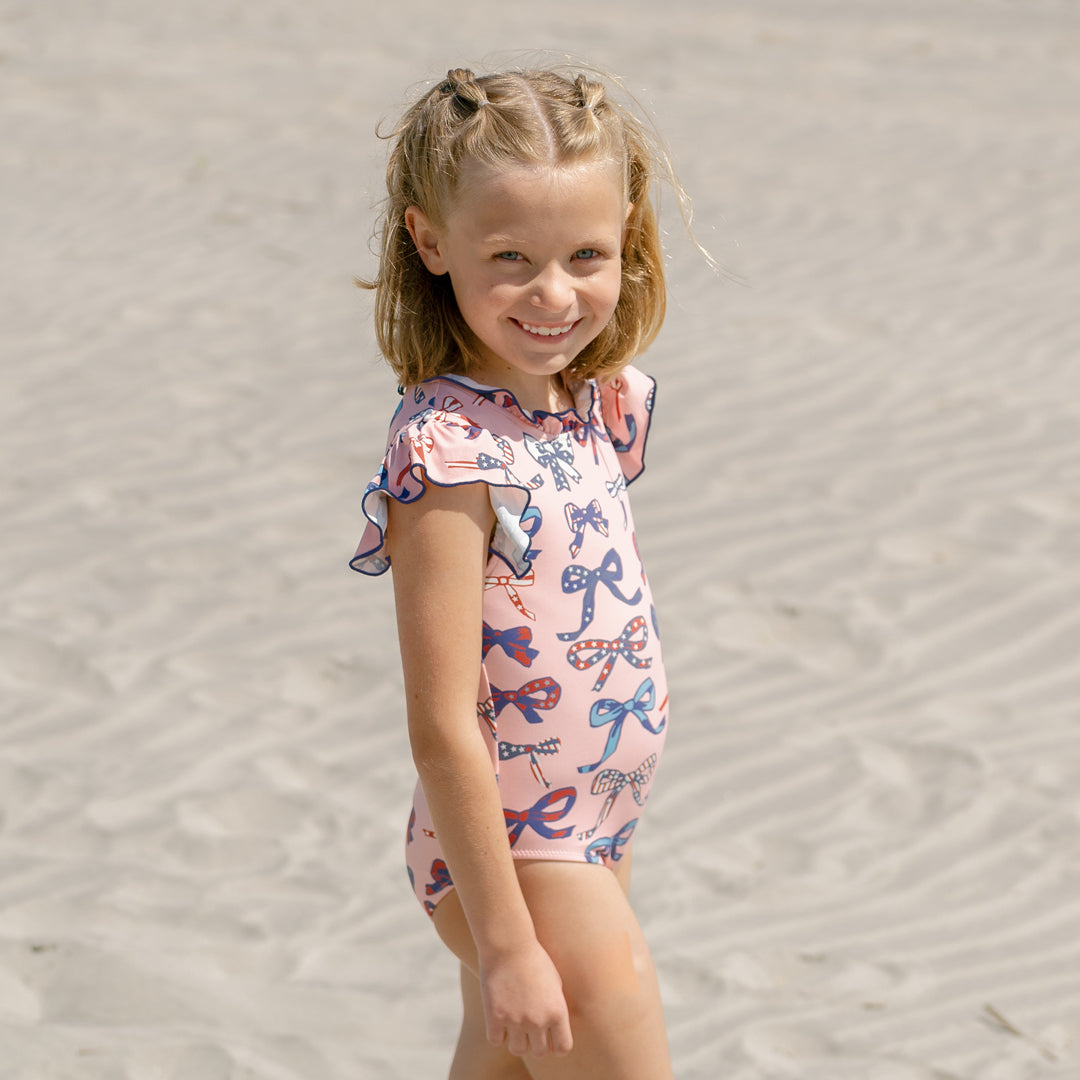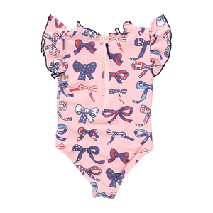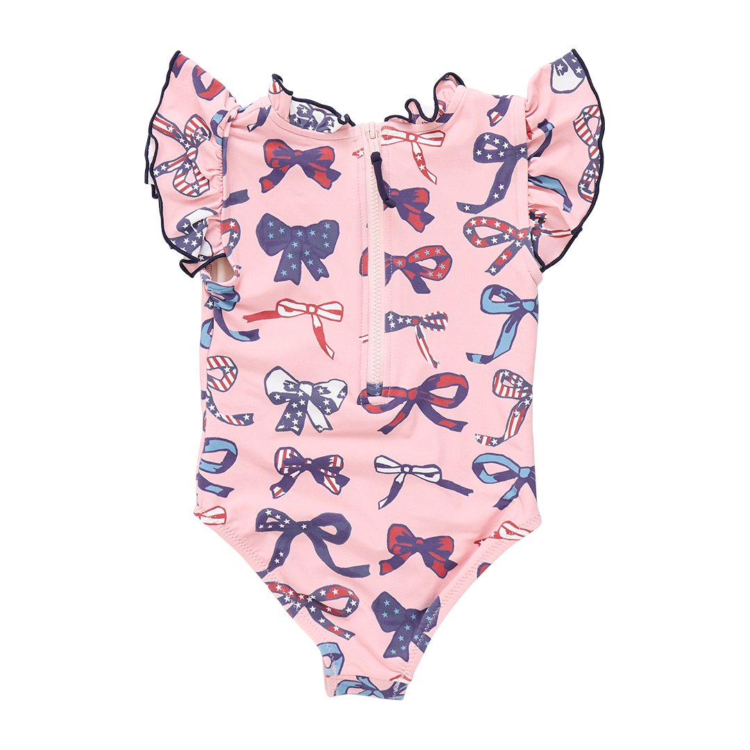 Summer Splash! An array of perfectly tied ribbons in shades of red, white and blue give a nod to the Stars and Stripes in our Pink Patriotic Bows conversation print shown here on our swan-dive-ready Girls Jennifer Suit. Now crafted in a boosted 50+ SPF material, this delightful one-piece features a navy accented ruffle collar and sleeve. A 3/4 zipper closure at the back, with an easy to grab colored pull rounds out the look. Baby sizes offer a ring snap closure at the bottom allows for easy diapering.