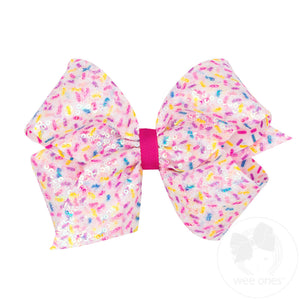 Make her 'do stand out with this fun & sparkly king confetti print bow! Perfect for any party or birthday girl who wants to light up the room! This bow is sure to stay in her hair all day with our patented WeeStay™ no-slip hair clip.